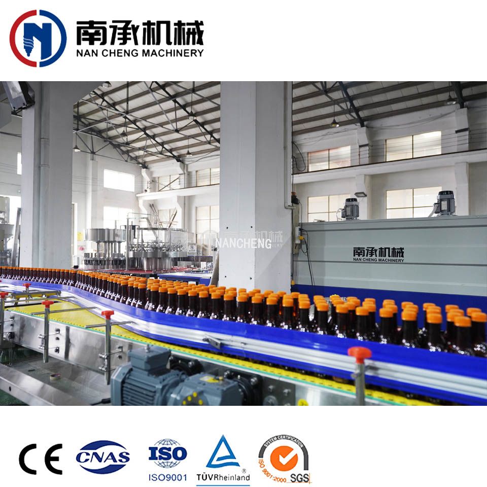 ①吹瓶机②上瓶平台(量大可用全自动理瓶机)③饮料灌装机(包括上盖机、理盖器、瓶盖消毒柜,产量大可用在线式瓶盖消毒柜)④灯检设备⑤吹干机:将瓶身吹干,便于后面的套标⑥套标机(根据瓶型,也可用贴标机)⑥喷码机:注册生产日期⑦全自动膜包机:果汁饮料 终的集合包装。