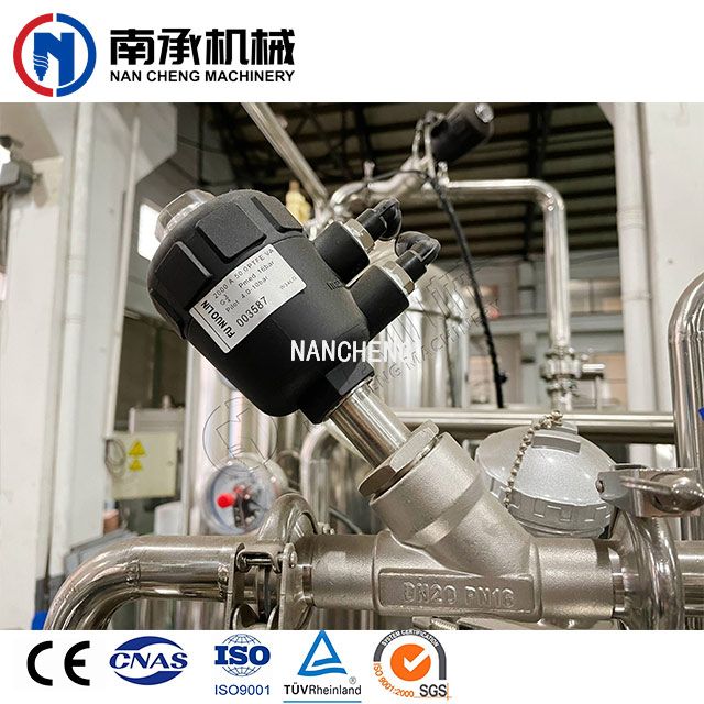 其工艺过程为:糖浆和净水经配比器按比例进入混合罐混合,用泵输入碳酸化罐,在碳酸化罐内装有管,罐内通有制冷剂、使混合后的物料冷却,以融入足够的二氧化碳。为保证二氧化碳与处理水有足够的接触时间,二氧化碳从进入碳酸化罐之间就开始充入。碳酸化后的物料进入灌装机,然后灌入容器中EBpay钱包有限公司